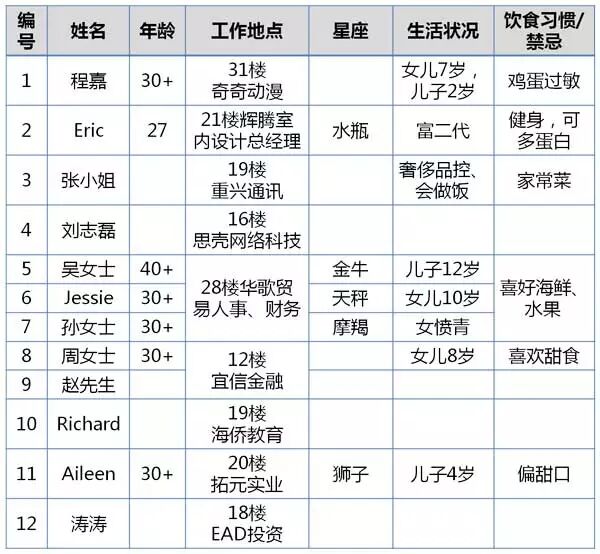 从不停研究客户们朋友圈信息,到列出客户列表再到拟定菜单再到采购食材,我的脑子里已经是一片血肉横飞。信息量有点大,但似乎又有点少。我把列出的表格给黄布斯看。