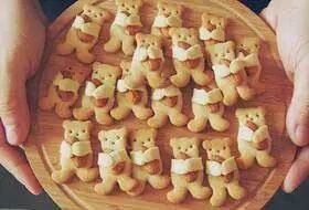 为了保险起见,第一次我拟定的菜单里有烤牛肉——从进口超市买的已经切的非常精致的和风牛肉,核算下来每份饭里五片就是三十多……这成本真心是不计算了,毕竟第一天……这种牛肉只要稍微提前腌制一会儿,再平底锅煎烤一下就好,不会老,不会硬,食材本身优秀是最安全的选择。快炒西兰花五彩甜椒——无功无过图个好看的配菜。火腿厚蛋烧——当地人多数都有点偏甜口这个应该合适,但要记得程嘉那份不能放,给换成培根卷芦笋了。椒盐烤香菇和茄子片——因为厚蛋烧有甜所以这个就做成椒盐口味的否则淋甜的酱汁也不错。主食是杂粮饭。汤是味增豆腐汤,水果是猕猴桃加提子。甜点我会烤那种抱着一颗杏仁的小熊饼干,其实非常简单,但好玩讨喜。