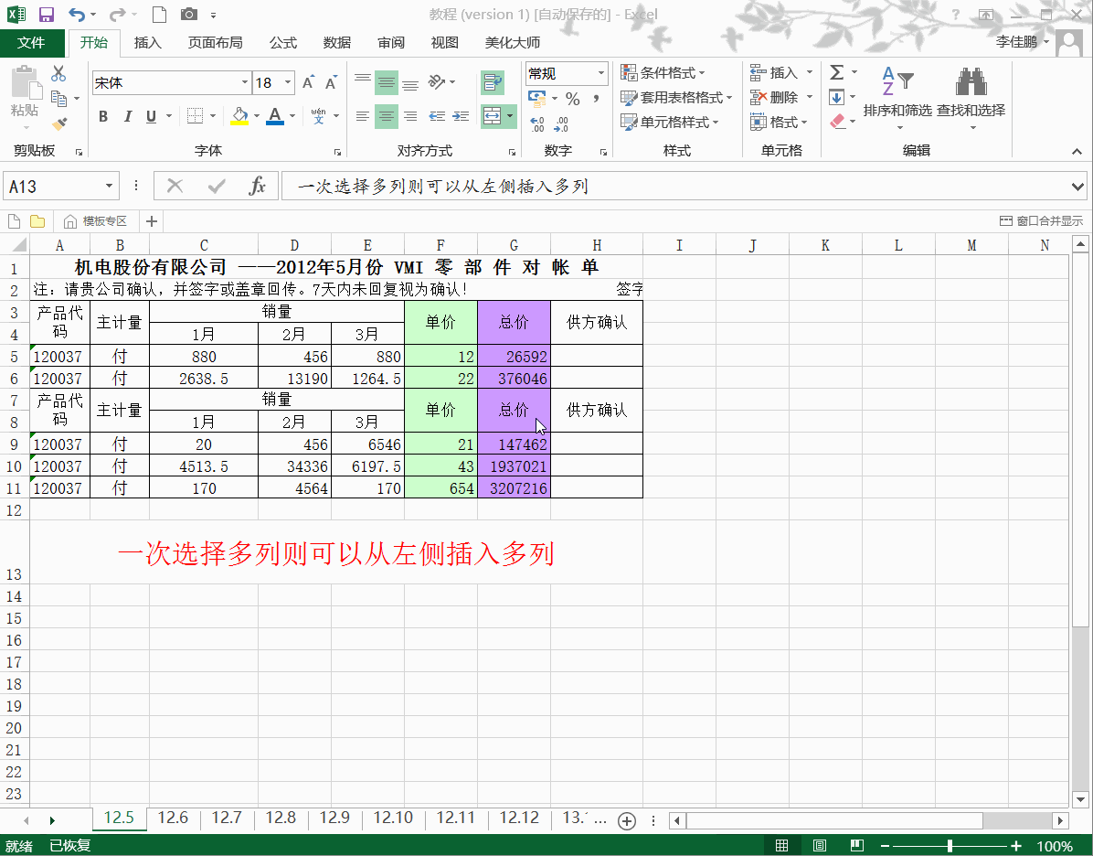 你还在一列列的插入么?多选之后可以插入多列,分别选择列后在没列右侧都会插入一列,终于不用一个一个的插入了。