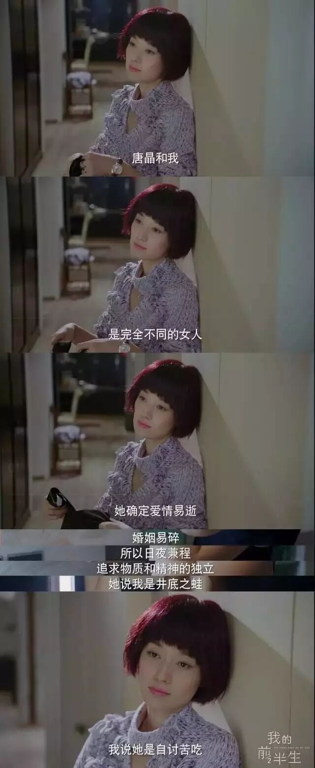 不靠男人,不靠婚姻,靠的是自己的努力和那一点清高傲气。学习的时候懂吃苦,工作的时候懂勤力,知道恋爱和婚姻完全是两回事,更知道尊严是自己给自己的。即便依旧夜晚难以入睡,在人前端着就像什么都没有发生的样子,努力活下去。