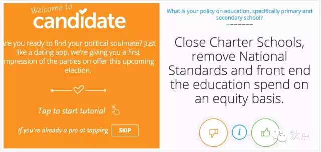 虽然失去了大幅图片这一个非常重要的特性,这类应用似乎还是依靠快速选择的方式发挥了他们的作用。每一屏都是一条简单的政策,目标用户——那些不太关心时政的选民——通过快速判断自己在每一条政策上的意见来找出更符合自己心愿的候选人。