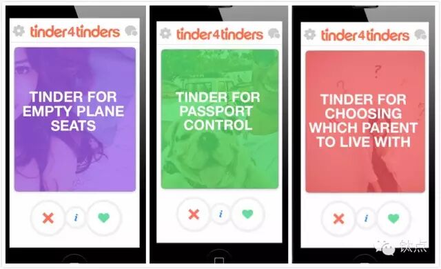 这个应用让你用Tinder模式来浏览(或者说表决)Tinder for X应用们。看起来似乎有种俄罗斯套娃的诡异感。 但从这种角度看,不管是应用里搜集的那些Tinder for X应用,还是这个奇特的应用本身,都表明当后来者用Tinder来类比的时候,他们说的早就不再是一个社交有关的东西。