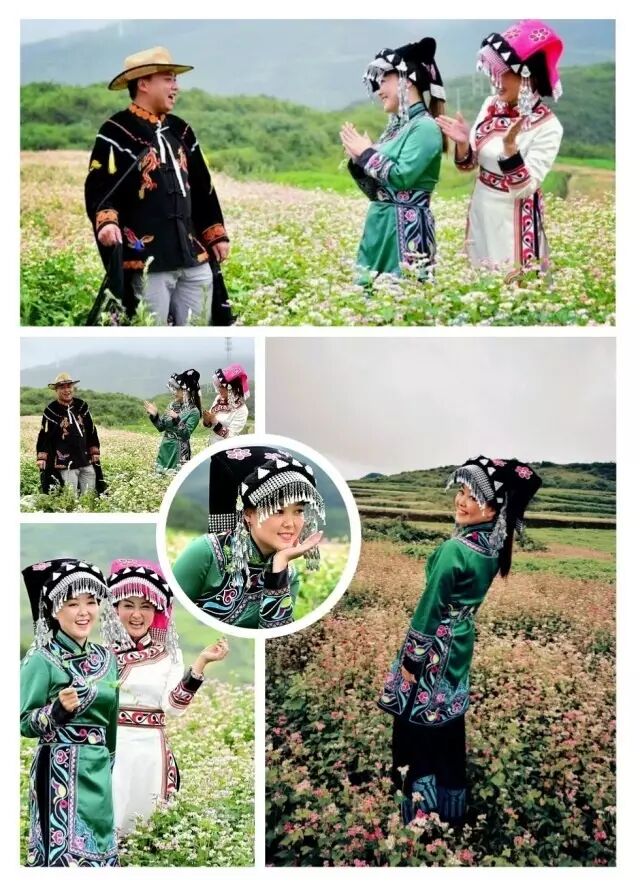 花海里有两个漂亮彝族女孩和小伙子在花海对歌,引来无数游客驻足观看、拍照,游客与女孩伙热情互动欢歌笑语在乌蒙山飘洒。