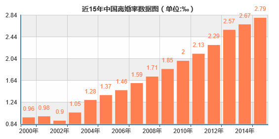 从上图可以看出,近15年中国的离婚率呈上升状态。