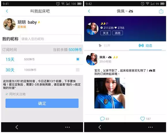 具体功能方面,“女神叫你起床”设置了“起床铃音配对”、“起床铃音1+N模式”,以及“定制专属铃音”等服务。“起床铃音配对”是指用户可以自己发音视频铃音,作为自己的铃音库,也可以向其他用户发送起床叫醒铃音,叫 TA 起床;“起床铃音1+N模式”是指用户设定的闹钟响起后,还可以陆续收到两条来自于附近用户的起床叫醒铃音,这样的玩法可以增加起床配对的成功率;“定制专属铃音”属于定向服务,用户可以向指定用户索取音视频铃音的定制,得到属于自己的专属铃音。