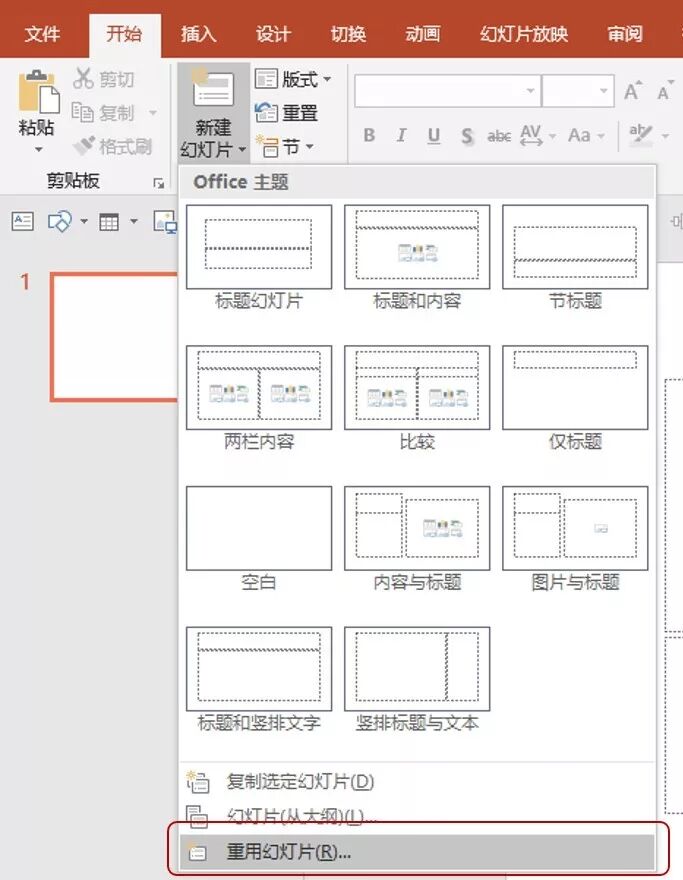 功能位置:开始——新建幻灯片——重用幻灯片。