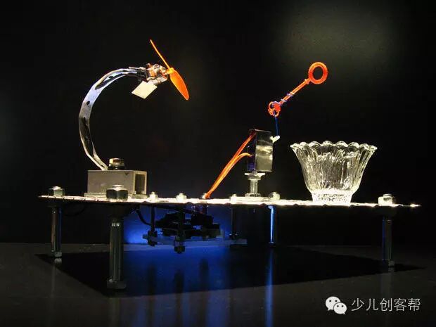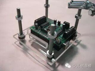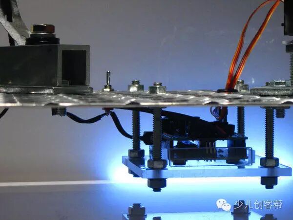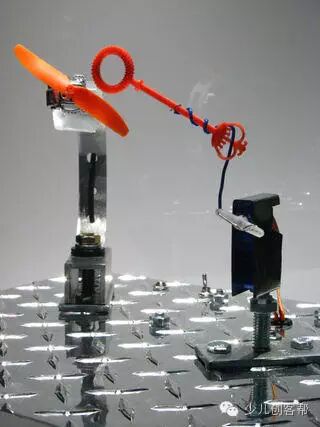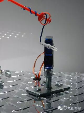 这个地方是小编我最佩服这个歪果朋友的地方,只是用胶把两个舵机巧妙的粘在了一起,巧妙的形成了一个有两个运动维度的机构,太奇妙了!这就是创意啊,小编只能说,我服!