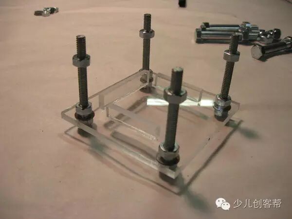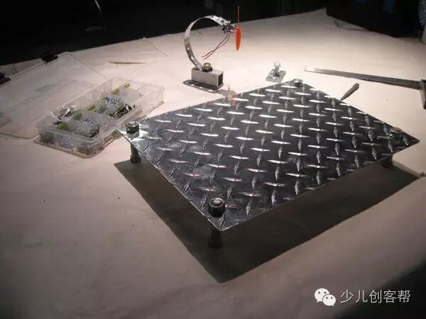 作者店里恰好有一些花纹板,所以就用这个做了平台。把Arduino放到平台下面这样板子就不会被洒上水。我可以很负责的告诉你,一个进水的微控制器肯定不能够很好的发挥作用,事情会一团糟。