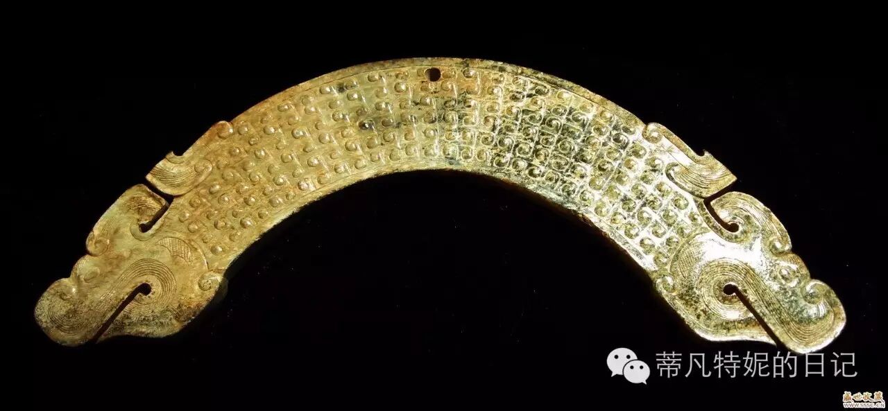 璜(音:huáng):半璧形或小于半环的弧形,两端有眼或中间靠上有眼。可为龙首、虎首,常有纹饰。璜是最早出现的佩饰,出土分布遍布全国。周代演变为礼器:"以玄璜礼北方"。